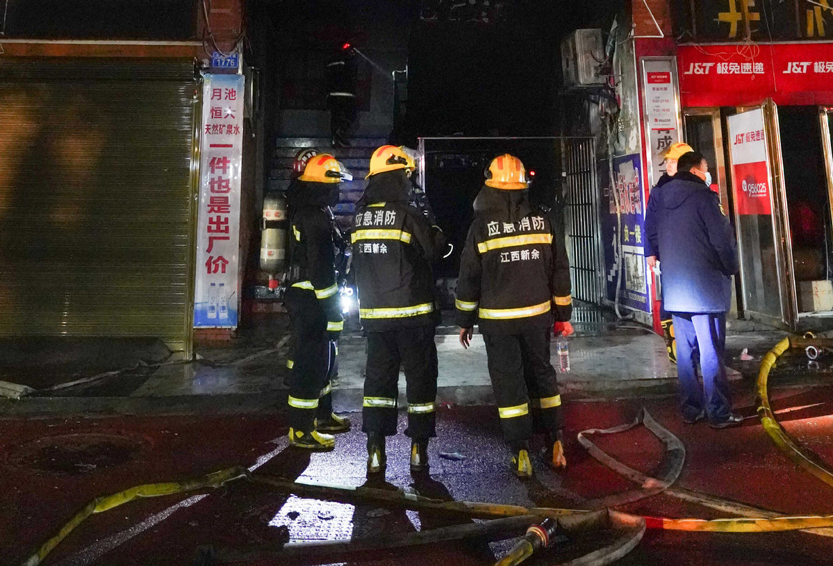 Firefighters work at the site of a building fire in Xinyu city, east China's Jiangxi Province, Jan 24, 2024. [Photo/Xinhua]