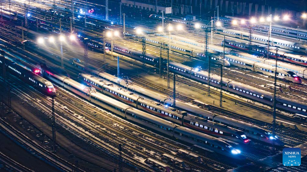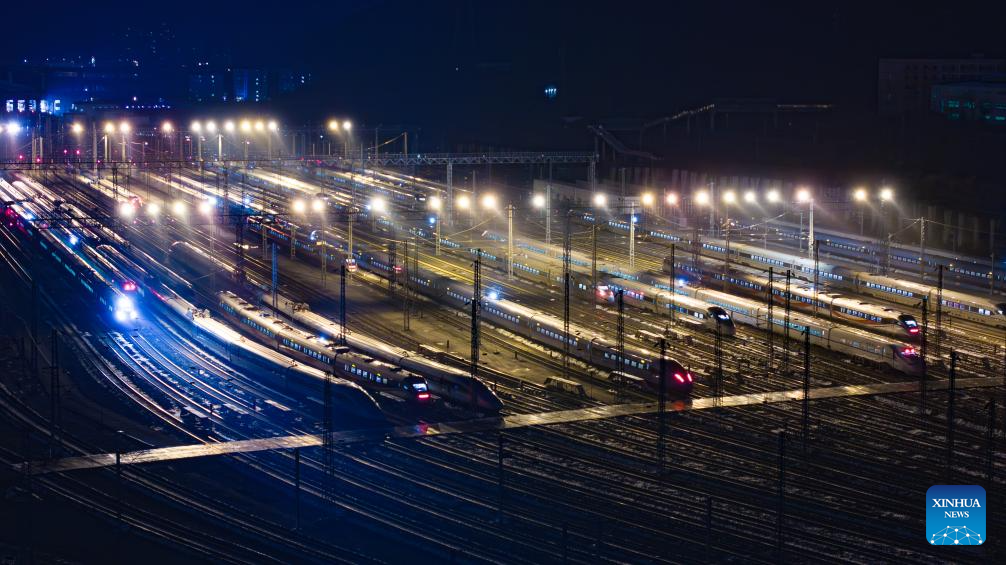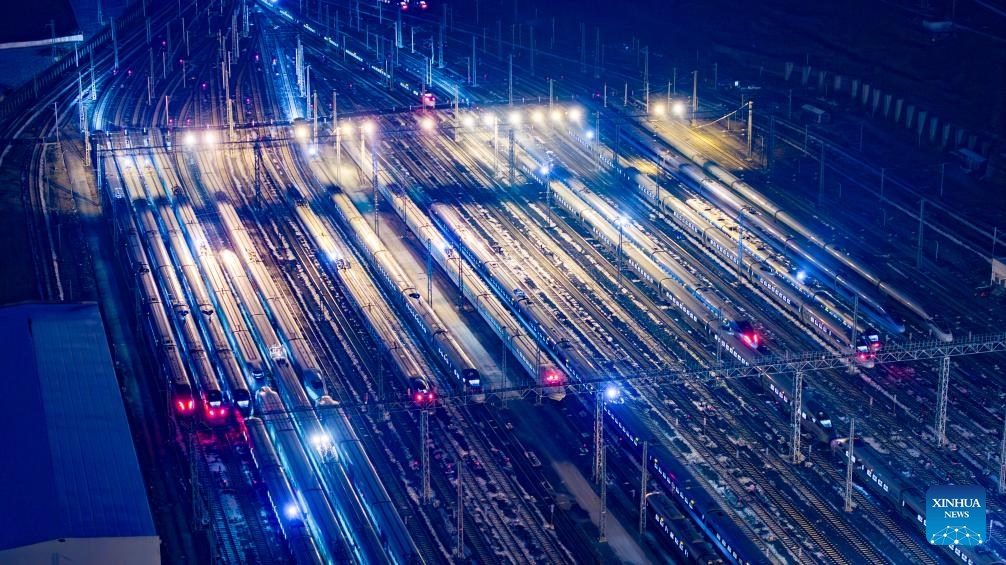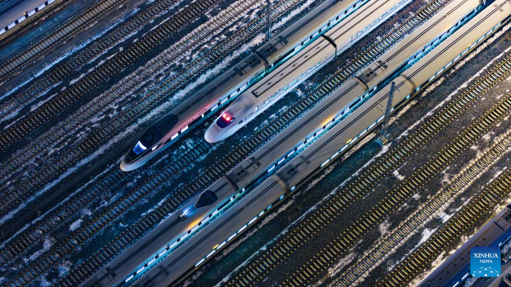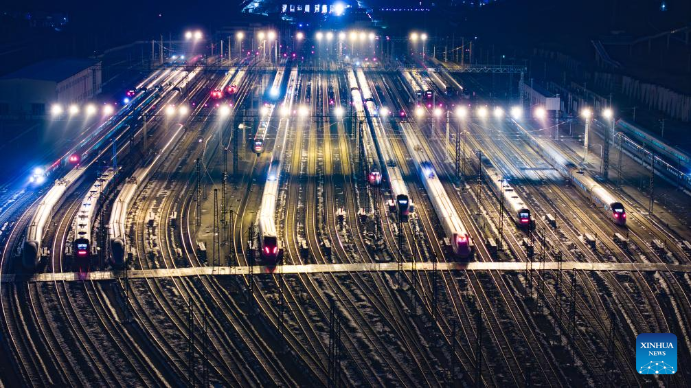 An aerial drone photo taken on Jan. 25, 2024 shows bullet trains at Guiyang North bullet train maintenance station in Guiyang, southwest China's Guizhou Province. The Spring Festival, China's biggest traditional festival, will fall on Feb. 10, while the Spring Festival travel rush, usually a period of high transportation demand as people return home for family reunions, will run from Jan. 26 to March 5. (Xinhua/Liu Xu)