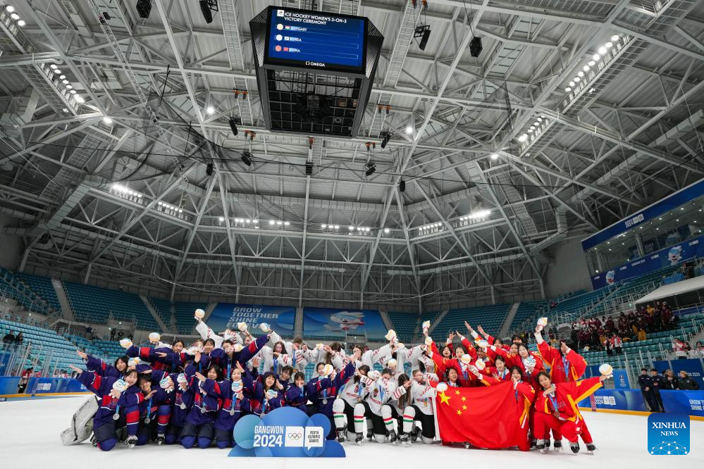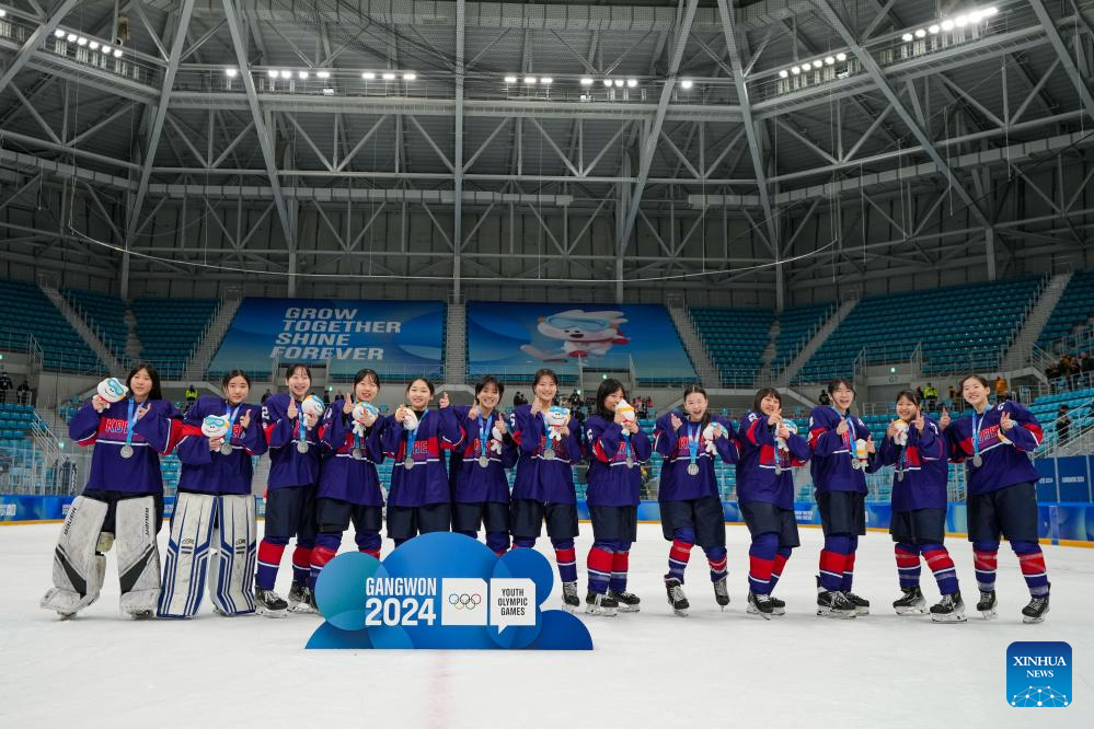 Team China pose for photos during the victory ceremony for the Women's 3-on-3 Tournament of ice hockey event at the Gangwon 2024 Winter Youth Olympic Games in Gangneung, South Korea, Jan. 25, 2024. (Xinhua/Zhang Xiaoyu)