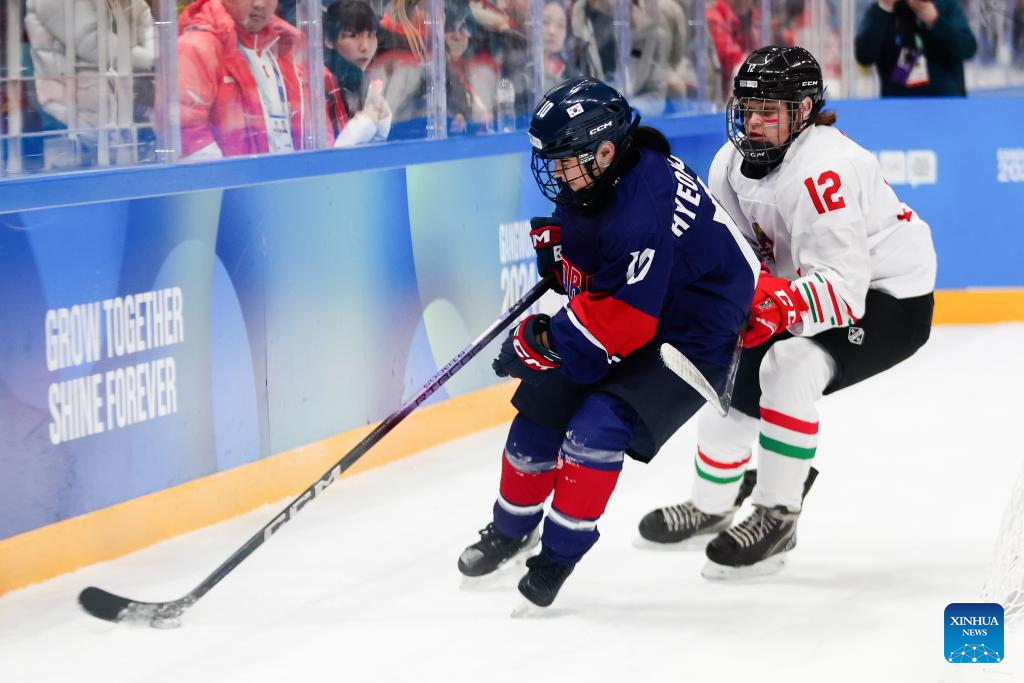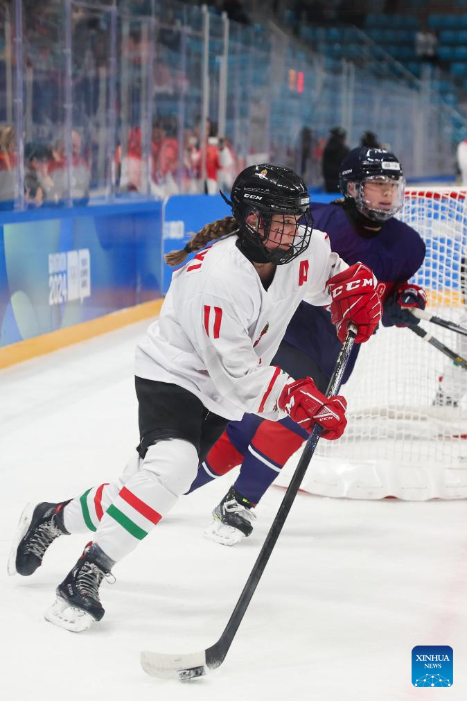Petra Polonyi (Front) of Hungary competes during the Women's 3-on-3 Tournament Gold Medal Game of ice hockey event between Hungary and South Korea at the Gangwon 2024 Winter Youth Olympic Games in Gangneung, South Korea, Jan. 25, 2024. (Xinhua/Xu Yanan)