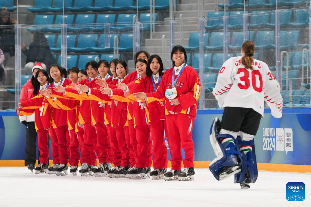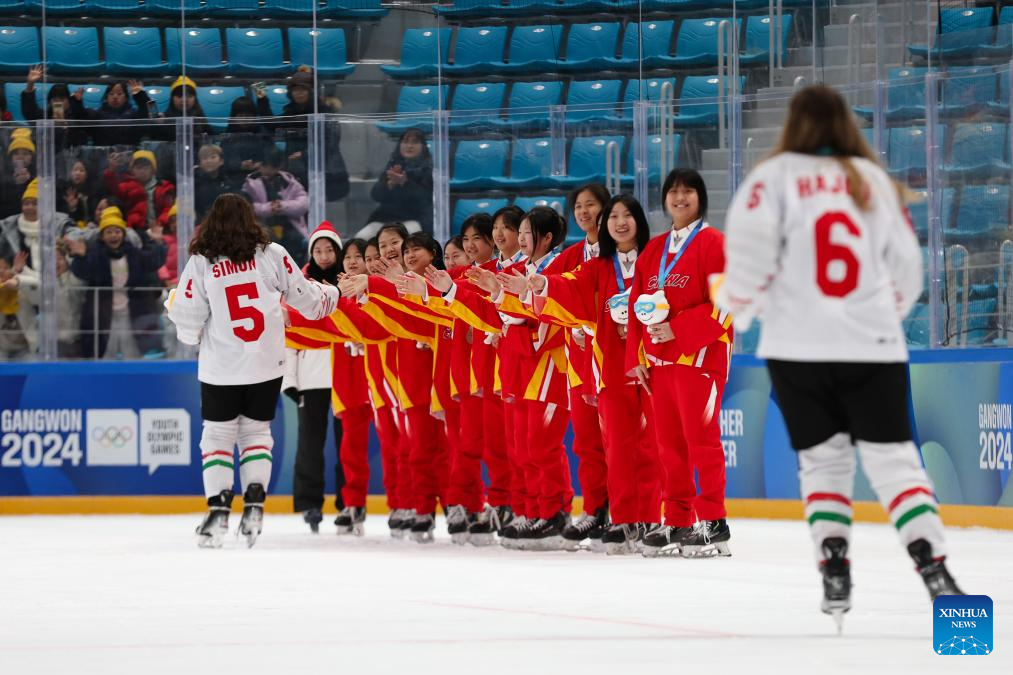 Players of team China clap hands with players of Hungary during the victory ceremony for the Women's 3-on-3 Tournamentof ice hockey event at the Gangwon 2024 Winter Youth Olympic Games in Gangneung, South Korea, Jan. 25, 2024. (Xinhua/Xu Yanan)