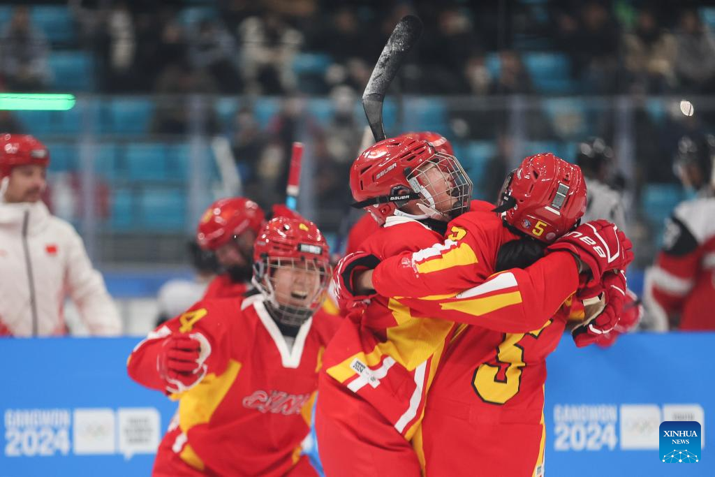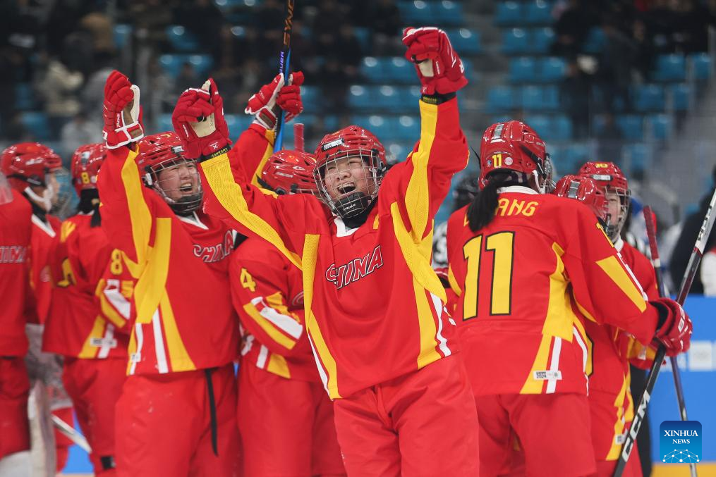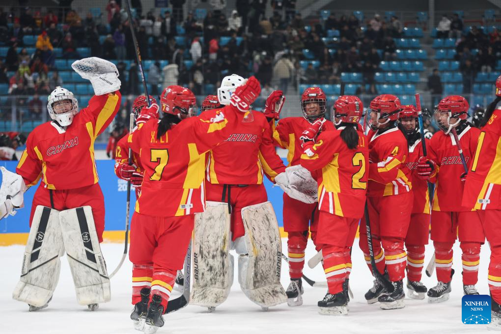 Team China celebrate after winning the Women's 3-on-3 Tournament Bronze Medal Match of ice hockey event between China and Italy at the Gangwon 2024 Winter Youth Olympic Games in Gangneung, South Korea, Jan. 25, 2024. (Xinhua/Xu Yanan)