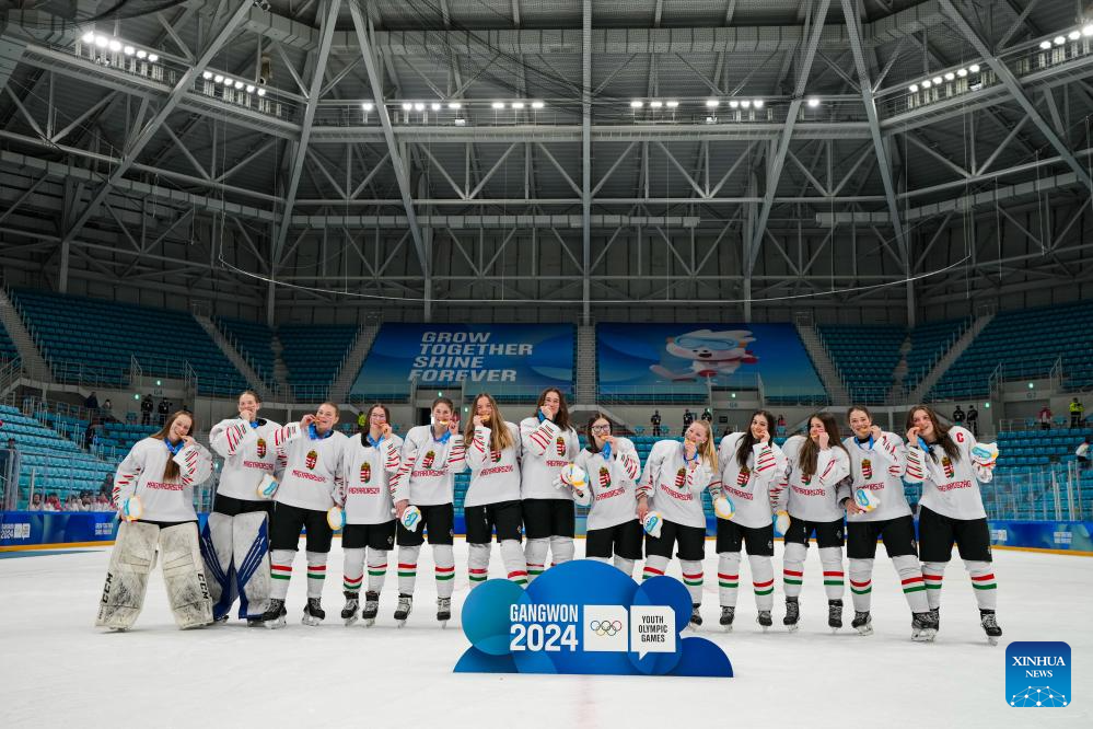 Players of Hungary celebrates after winning the Women's 3-on-3 Tournament Gold Medal Game of ice hockey event between Hungary and South Korea at the Gangwon 2024 Winter Youth Olympic Games in Gangneung, South Korea, Jan. 25, 2024. (Xinhua/Xu Yanan)