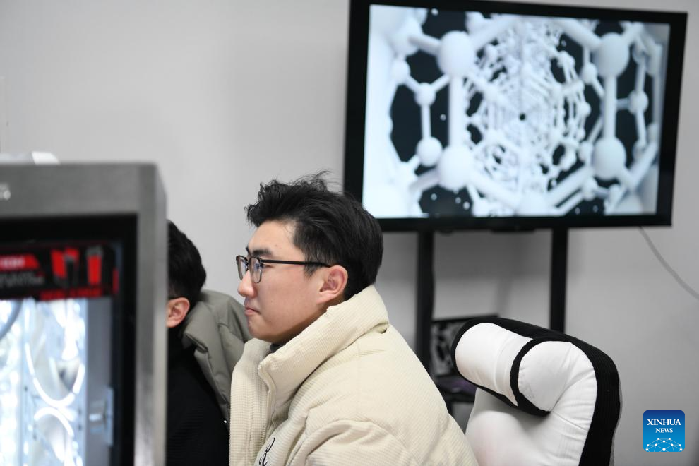 Yang Yuanfan (L) and an international student from Madagascar create a scientific visualization product at University of Science and Technology of China in Hefei, east China's Anhui Province, Dec. 29, 2023. (Photo by Guo Ruqi/Xinhua)