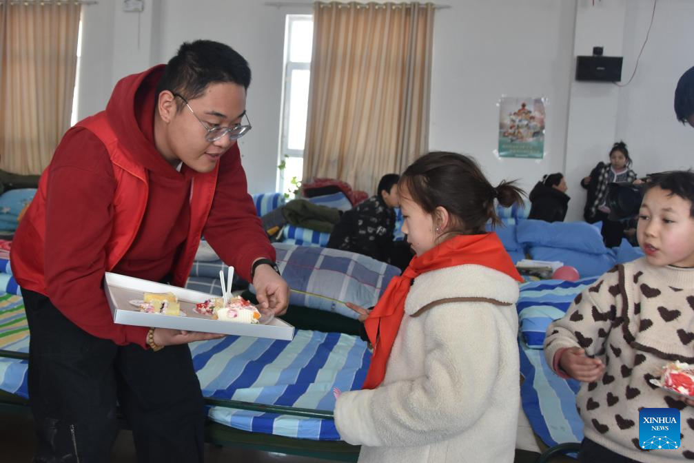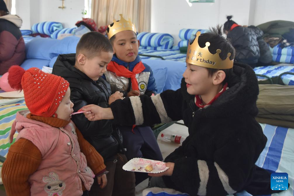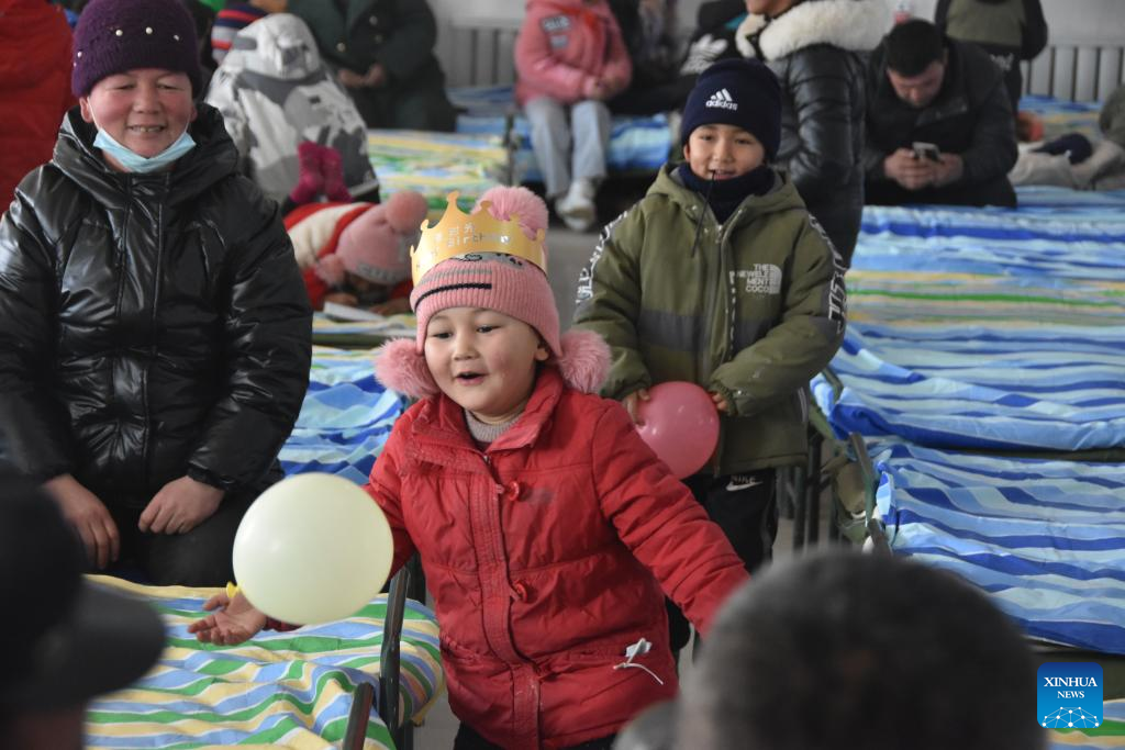 Kids share birthday cakes at a resettlement site in Wushi County, northwest China's Xinjiang Uygur Autonomous Region, Jan. 25, 2024. (Xinhua/Gu Yu)