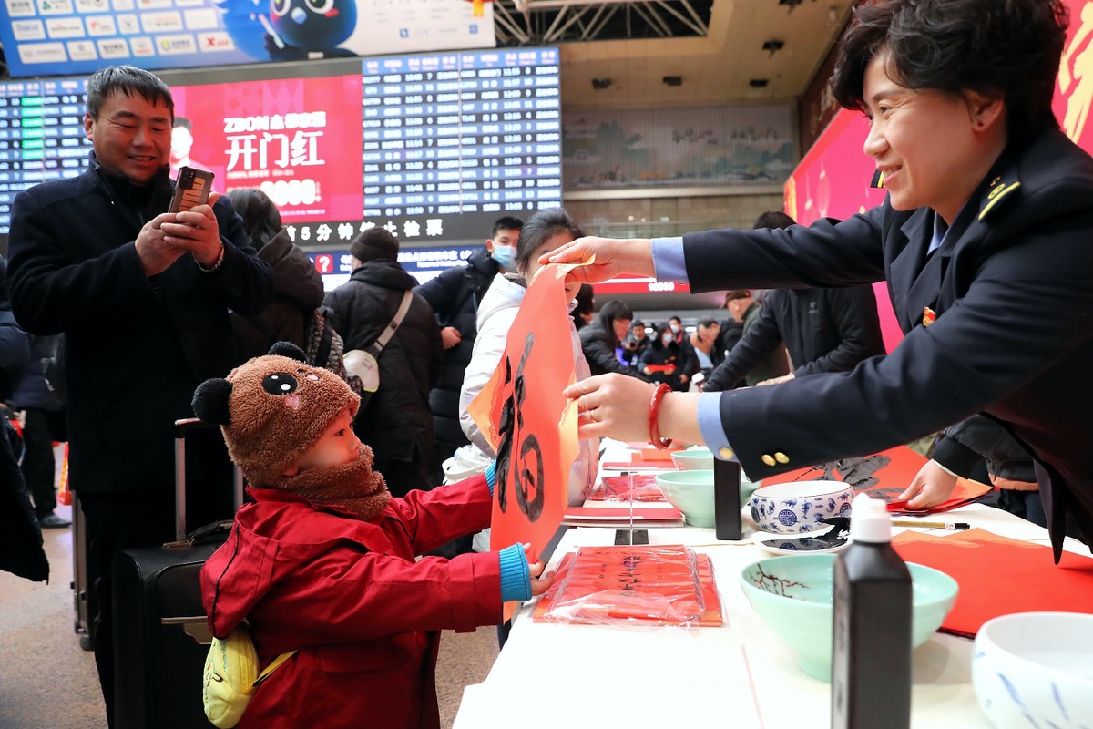 A child receives the "Fu" character written by a railway staff member during an activity to welcome the Spring Festival held at Beijing West Railway Station, on Jan 26, 2024. [Photo by Wang Zhuangfei/chinadaily.com.cn]