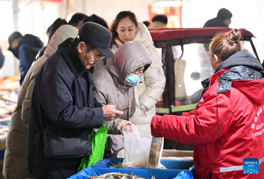 People select shrimps during a fair in preparation for the upcoming Spring Festival in north China's Tianjin, Jan. 28, 2024. (Xinhua/Li Ran)