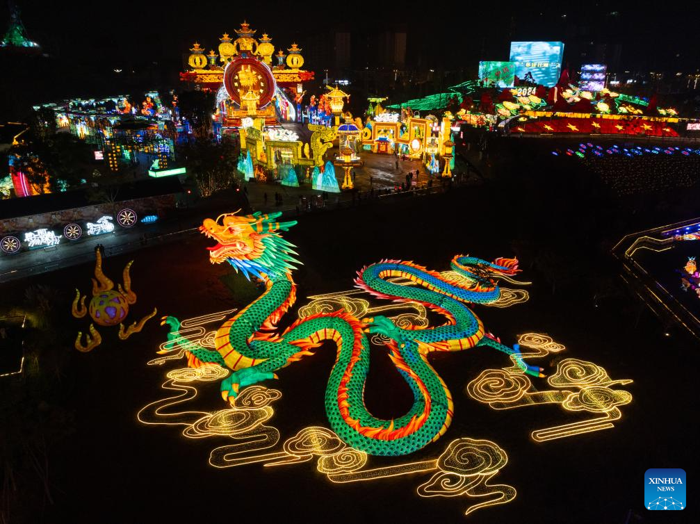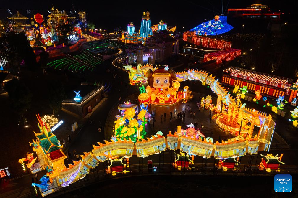 A drone photo taken on Jan. 26, 2024 shows light installations for an upcoming lantern show in Zigong, southwest China's Sichuan Province. The city of Zigong is well known for the large number of dinosaur fossils that have been unearthed in past decades. (Xinhua/Shen Bohan)