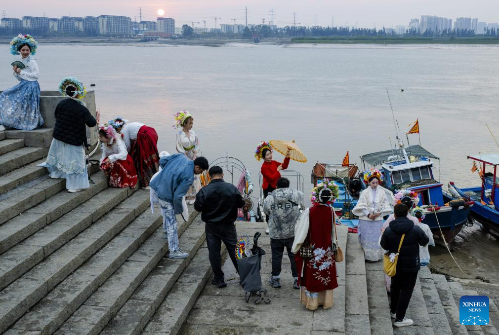 Tourists wearing flowery headwear pose for photos at Xunpu Village of Quanzhou City, southeast China's Fujian Province, Jan. 26, 2024. Xunpu flowery headwear, dubbed "overhead gardens," have been a signature of "Xunpu Women Customs" listed as a national intangible heritage in 2008. They attracted millions of eyes in the cyber world in early 2023, followed by a sustainable tourist boom in the village, where visitors are able to literally fit their heads in them. Photo-shooting, dining and other hospitality services have diversified the source of income for residents of this small costal village that used to rely on fishing and mudflat aquaculture. (Xinhua/Wei Peiquan)