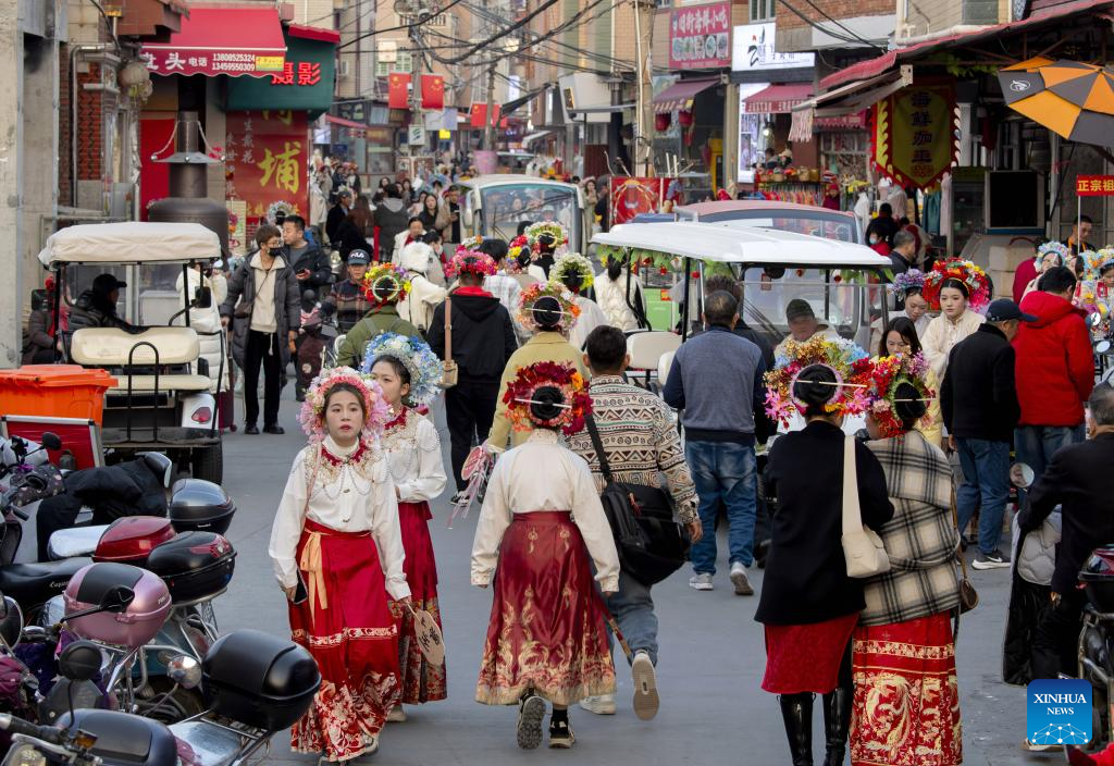 Tourists wearing flowery headwear are seen at Xunpu Village of Quanzhou City, southeast China's Fujian Province, Jan. 26, 2024. Xunpu flowery headwear, dubbed "overhead gardens," have been a signature of "Xunpu Women Customs" listed as a national intangible heritage in 2008. They attracted millions of eyes in the cyber world in early 2023, followed by a sustainable tourist boom in the village, where visitors are able to literally fit their heads in them. Photo-shooting, dining and other hospitality services have diversified the source of income for residents of this small costal village that used to rely on fishing and mudflat aquaculture. (Xinhua/Wei Peiquan)