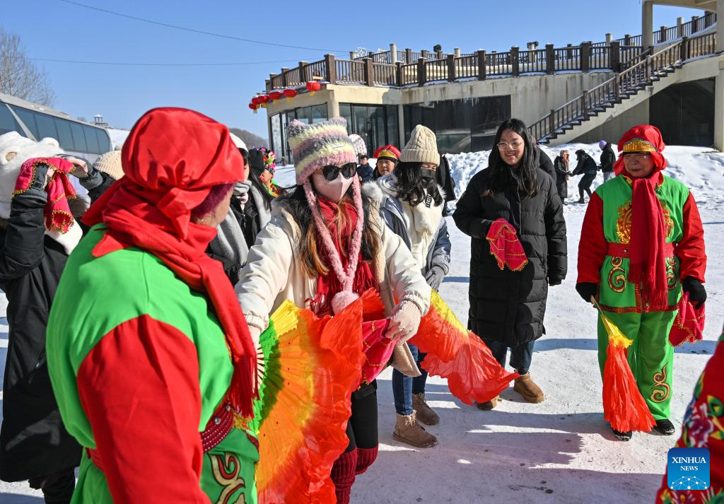 Taiwan students try Yangge dance in Shulan, northeast China's Jilin Province on Jan. 26, 2024. (Xinhua/Chen Yehua)