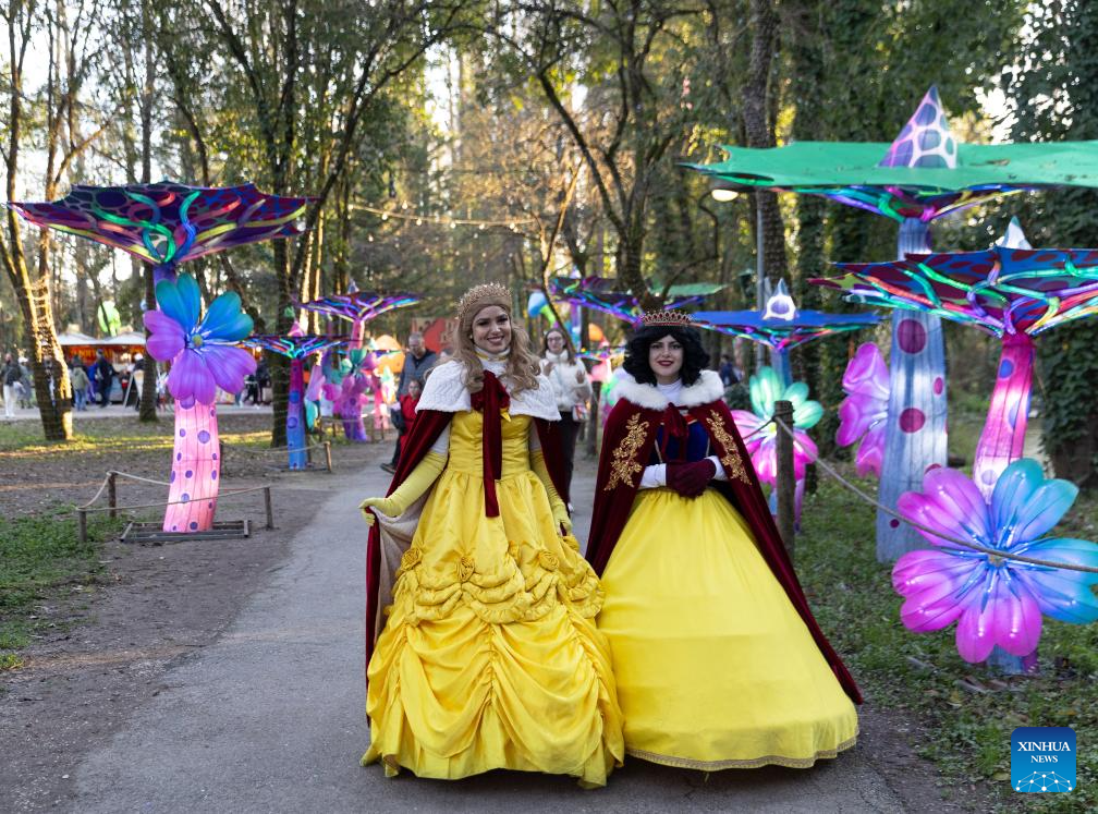 Performers march during the International Lantern Festival "Lanternia" in Cassino, central Italy, Jan. 28, 2024. More than 300 Chinese lanterns made by artisans from Zigong, a southwest China's city famous for its lantern making, are exhibited here. Since its opening on Dec. 8, 2023, the lantern show has attracted approximately 80,000 visitors. (Xinhua/Li Jing)