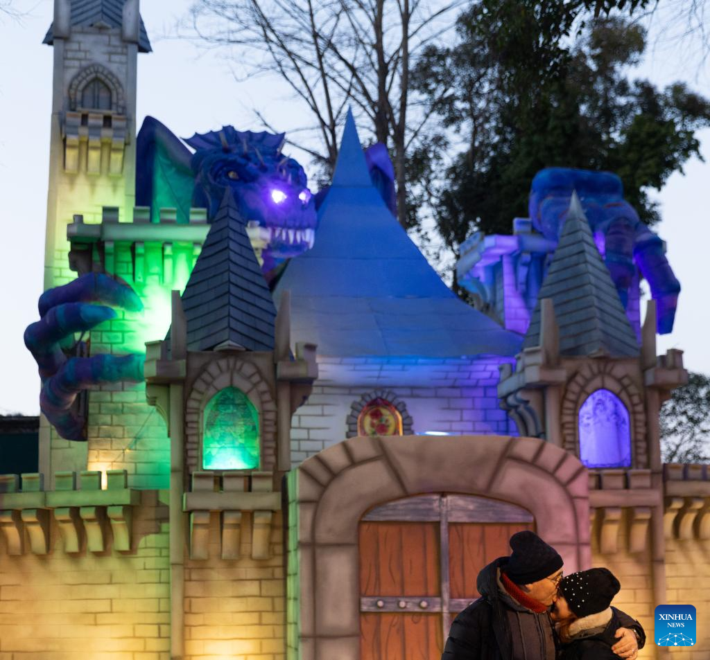 A couple kisses in front of a lantern during the International Lantern Festival "Lanternia" in Cassino, central Italy, Jan. 28, 2024. More than 300 Chinese lanterns made by artisans from Zigong, a southwest China's city famous for its lantern making, are exhibited here. Since its opening on Dec. 8, 2023, the lantern show has attracted approximately 80,000 visitors. (Xinhua/Li Jing)