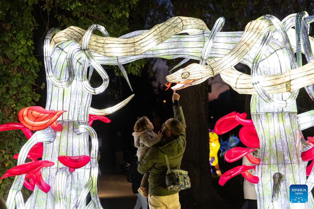 Visitors look at a lantern during the International Lantern Festival "Lanternia" in Cassino, central Italy, Jan. 28, 2024. More than 300 Chinese lanterns made by artisans from Zigong, a southwest China's city famous for its lantern making, are exhibited here. Since its opening on Dec. 8, 2023, the lantern show has attracted approximately 80,000 visitors. (Xinhua/Li Jing)
