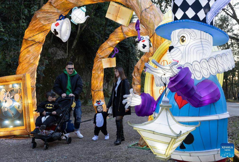 Visitors walk past lanterns during the International Lantern Festival "Lanternia" in Cassino, central Italy, Jan. 28, 2024. More than 300 Chinese lanterns made by artisans from Zigong, a southwest China's city famous for its lantern making, are exhibited here. Since its opening on Dec. 8, 2023, the lantern show has attracted approximately 80,000 visitors. (Xinhua/Li Jing)