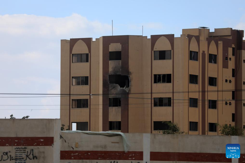 A damaged building is seen in the southern Gaza Strip city of Khan Younis, on Jan. 29, 2024. The Hamas-run Health Ministry in Gaza said on Monday that the Palestinian death toll from the Israeli offensive on the enclave has reached 26,637 since it began on Oct. 7, 2023. (Photo by Rizek Abdeljawad/Xinhua)