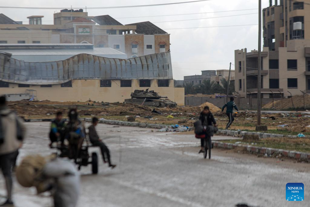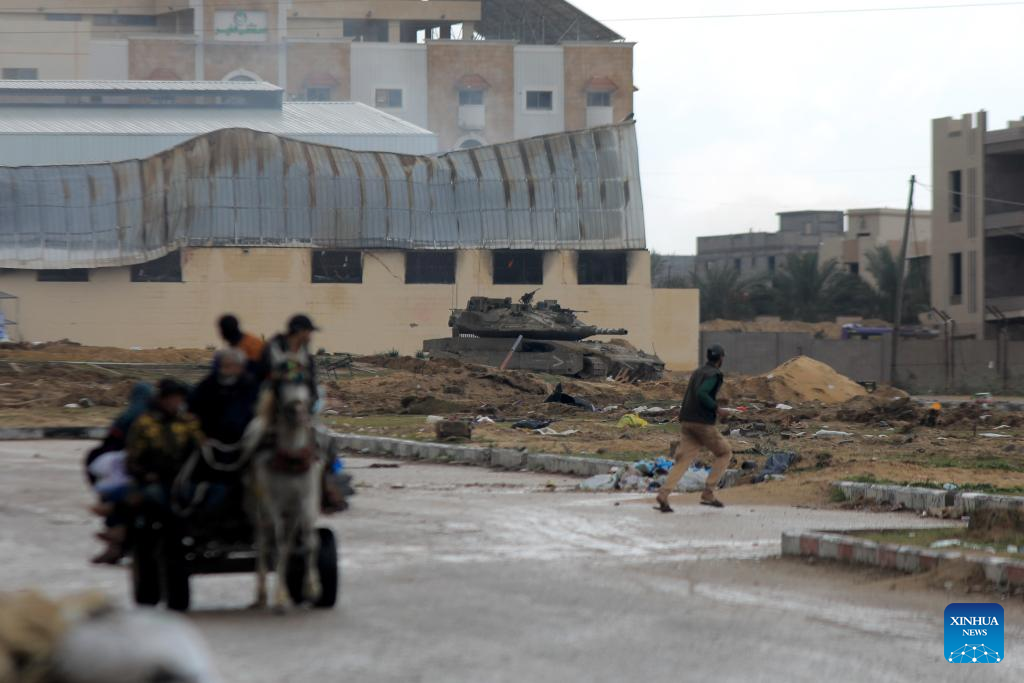 An Israeli tank is seen in the southern Gaza Strip city of Khan Younis, on Jan. 29, 2024. The Hamas-run Health Ministry in Gaza said on Monday that the Palestinian death toll from the Israeli offensive on the enclave has reached 26,637 since it began on Oct. 7, 2023. (Photo by Rizek Abdeljawad/Xinhua)