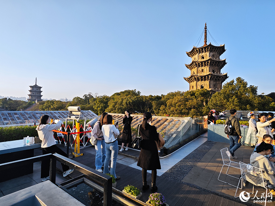 Tourists take photos on the rooftop of the tourist service center of Xijie Street with the East and West Pagodas in the background. (People's Daily Online/Huang Dongyi)