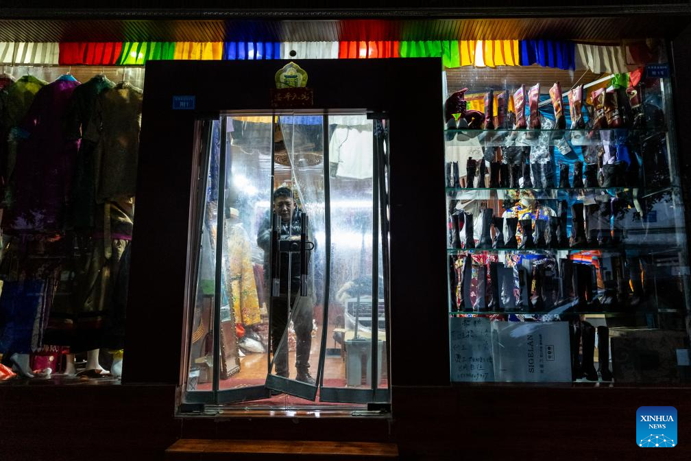 Nyima Wangden opens his clothing store to business early morning in Chengdu, southwest China's Sichuan Province, Jan. 4, 2024. (Xinhua/Shen Bohan)