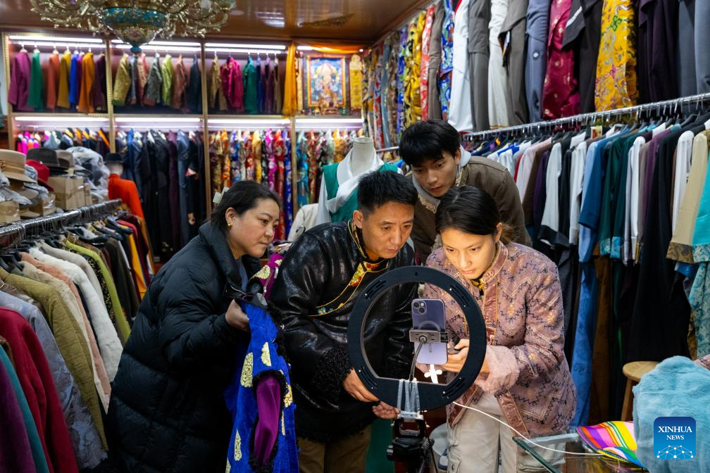 Nyima Wangden films people dancing in traditional Tibetan costumes provided by his clothing store in Chengdu, southwest China's Sichuan Province, Jan. 20, 2024. (Xinhua/Shen Bohan)
