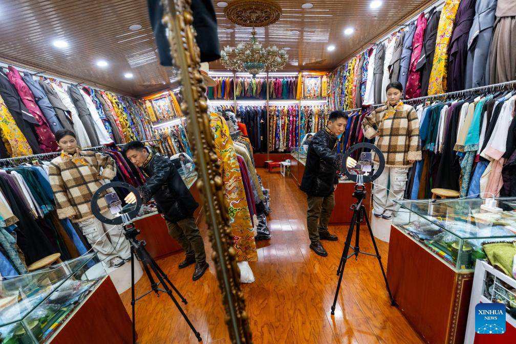 Nyima Wangden (L) and his daughter sell traditional Tibetan costumes via live streaming at their clothing store in Chengdu, southwest China's Sichuan Province, Jan. 5, 2024. (Xinhua/Shen Bohan)
