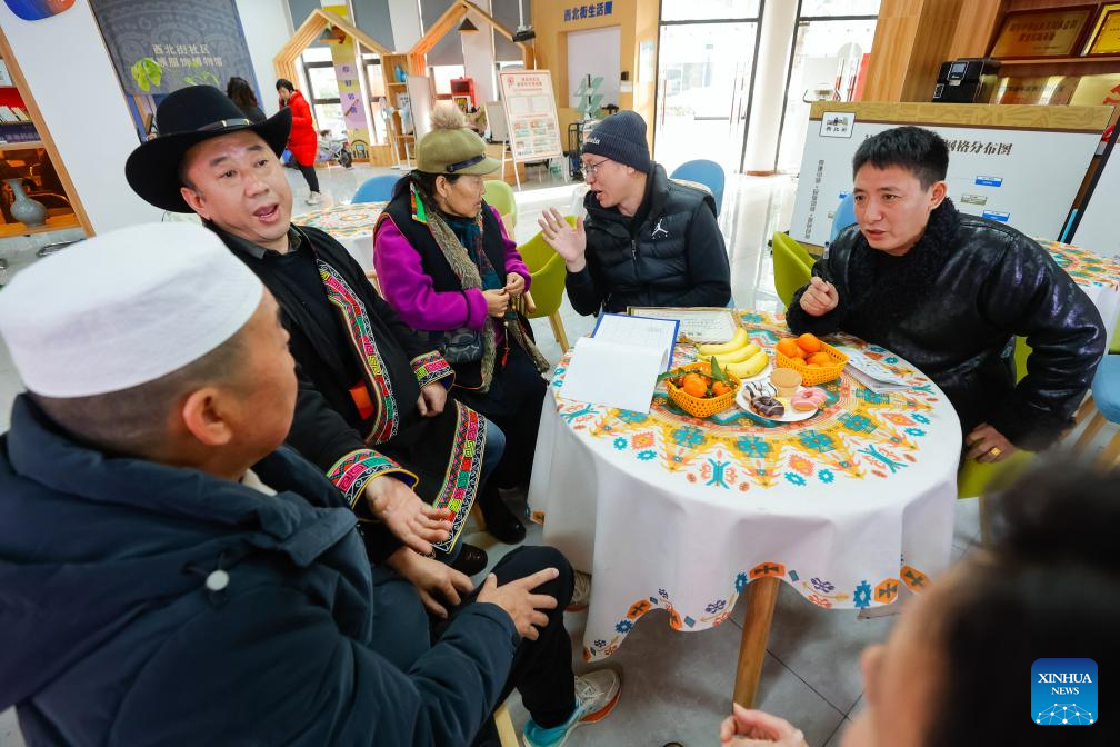 Nyima Wangden (1st R) discusses community governance issues with other business representatives at a community service center in Chengdu, southwest China's Sichuan Province, Jan. 16, 2024. (Xinhua/Shen Bohan)