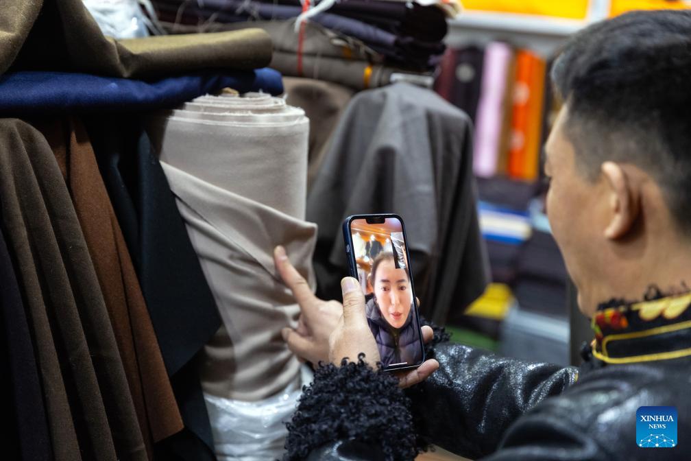 Nyima Wangden shows cloth for traditional Tibetan costumes to his customer via video chat at a market in Chengdu, southwest China's Sichuan Province, Jan. 5, 2024. (Xinhua/Shen Bohan)