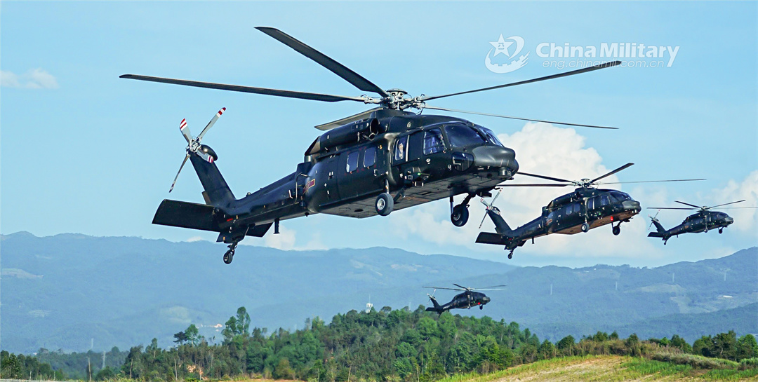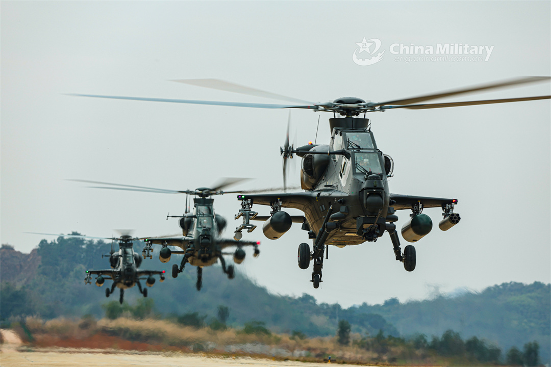 Helicopters attached to a brigade with the army under the PLA Southern Theater Command head to the designated training airspace during a multi-day and multi-subject training exercise on January 4, 2024. (eng.chinamil.com.cn/Photo by Li Chunguo)
