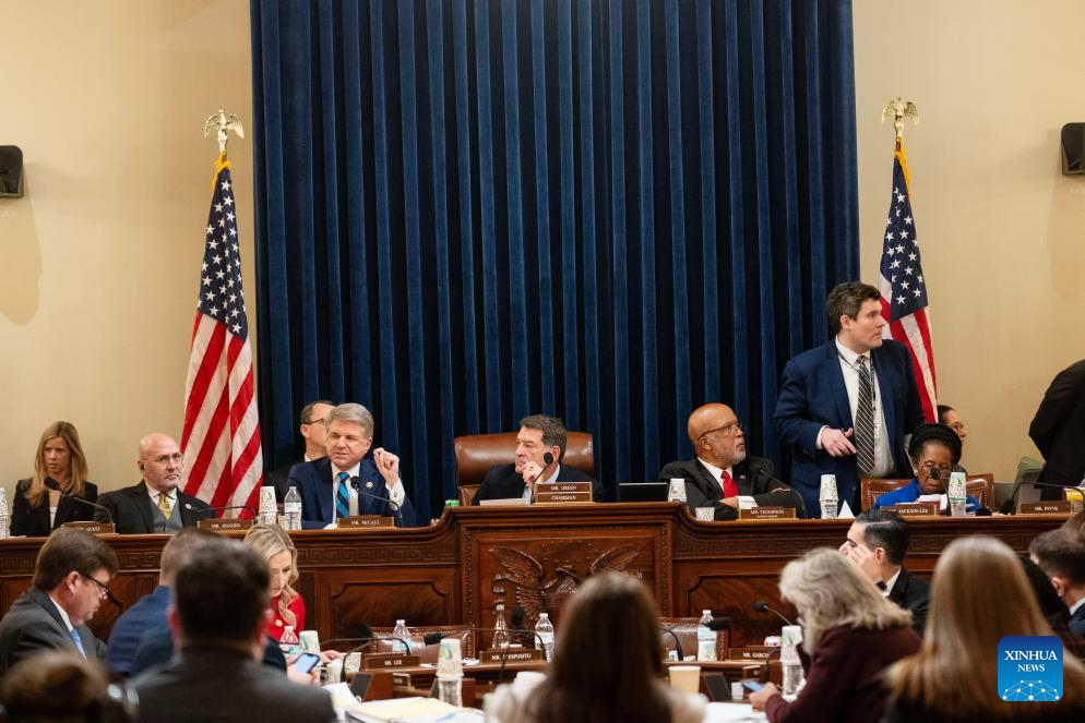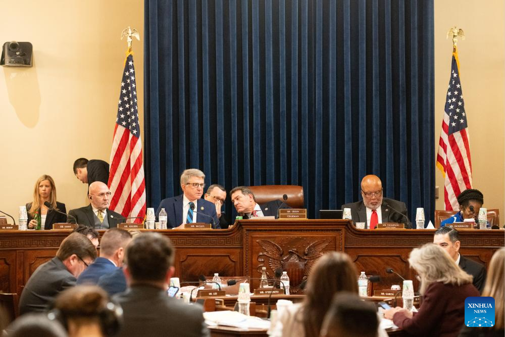 Photo taken on Jan. 30, 2024 shows a U.S. House Homeland Security Committee meeting to impeach Homeland Security Secretary Alejandro Mayorkas over the crisis at the U.S.-Mexico border, on Capitol Hill in Washington, D.C., the United States. Republicans in the U.S. House announced impeachment charges against Homeland Security Secretary Alejandro Mayorkas, accusing him of "willfully and systematically refusing to obey the law" on immigration issues, leading to a failure to control immigration at the U.S.-Mexico border. (Xinhua/Liu Jie)