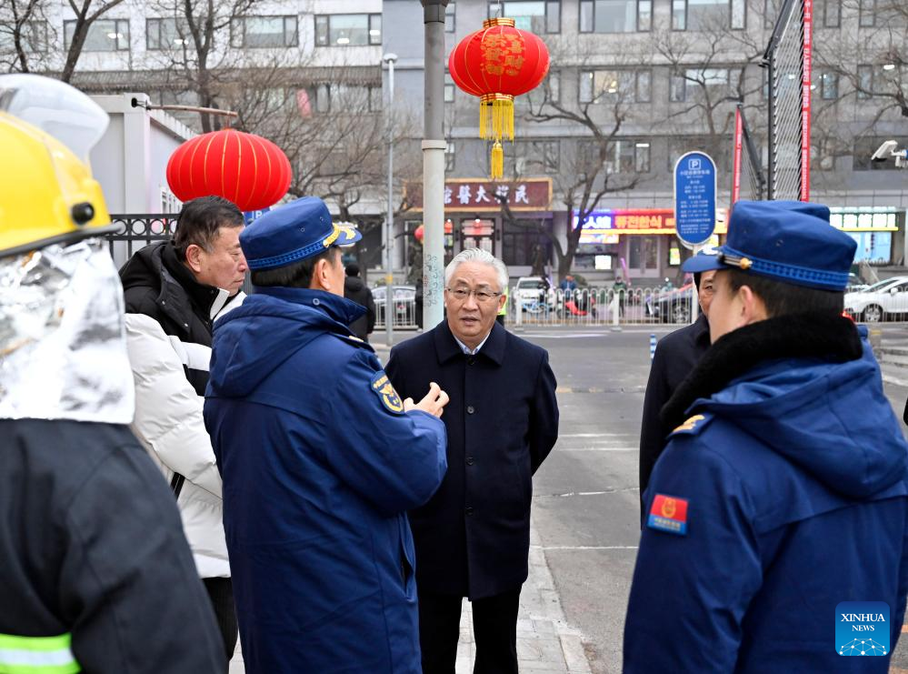 Chinese Vice Premier Zhang Guoqing, also a member of the Political Bureau of the Communist Party of China Central Committee, visits a residential compound in Dongcheng District while inspecting work on fire safety in Beijing, capital of China, Jan. 30, 2024. (Xinhua/Yin Bogu)
