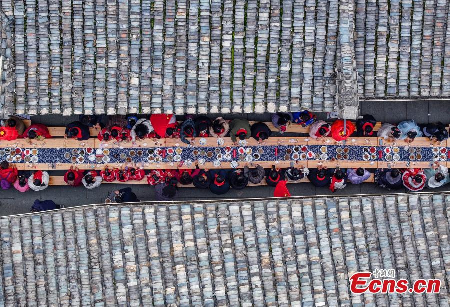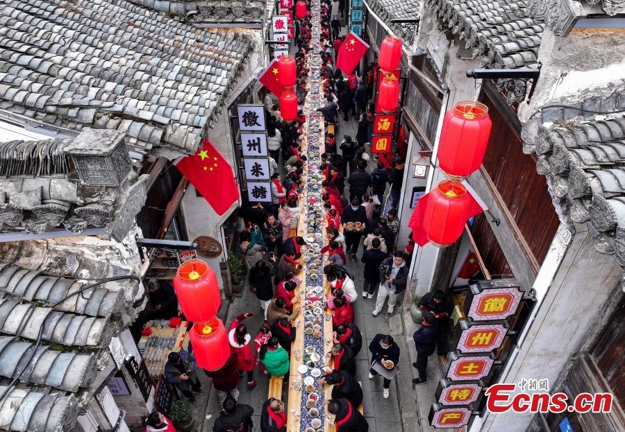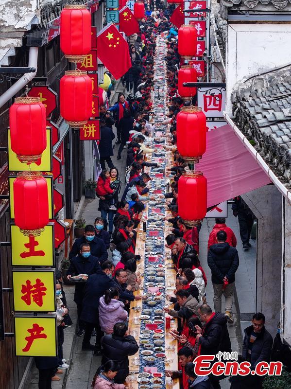 Tourists enjoy a long-table banquet along a street in Huangshan city, east China's Anhui Province, Jan. 30, 2024. (Photo: China News Service/Shi Yalei)