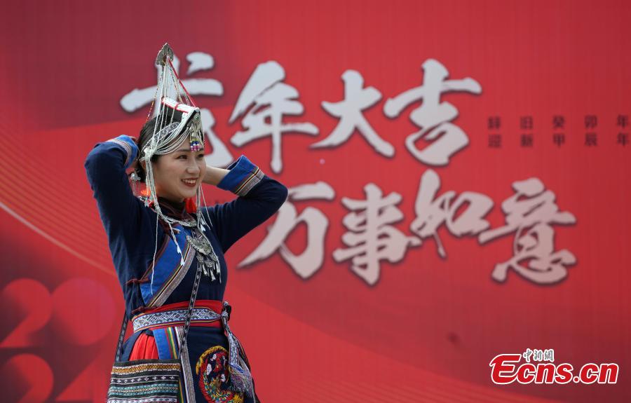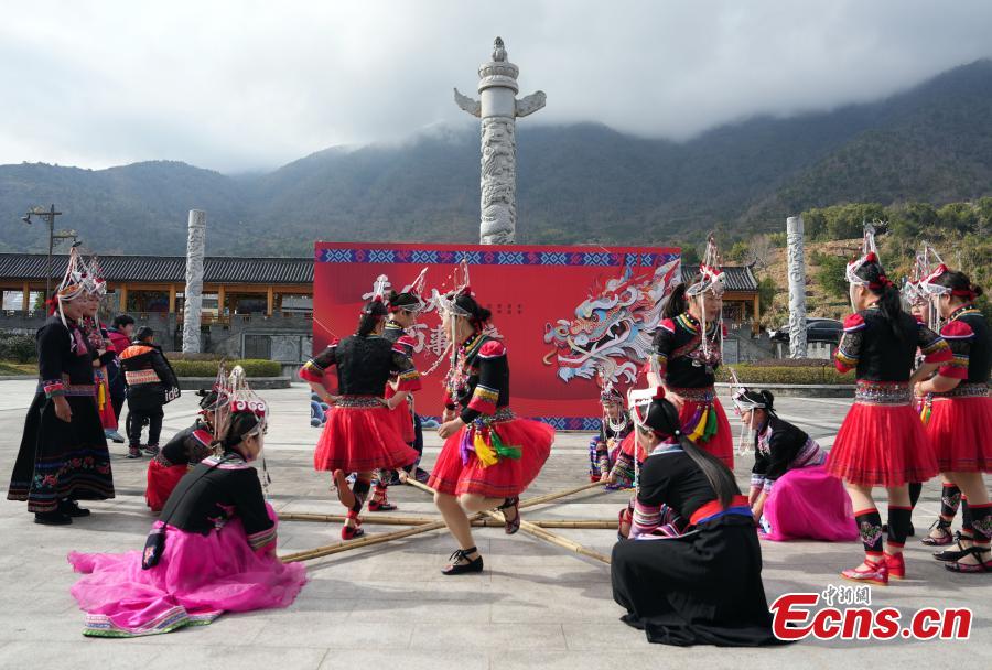 Women of She ethnic group in traditional costumes participate in a bamboo dance for a local Spring Festival gala at Cangnan County of Wenzhou City, east China's Zhejiang Province, Jan. 30, 2024. (Photo: China News Service/Mao Jianjun)