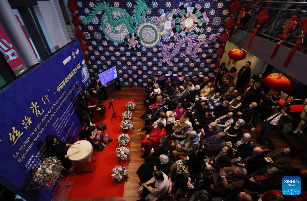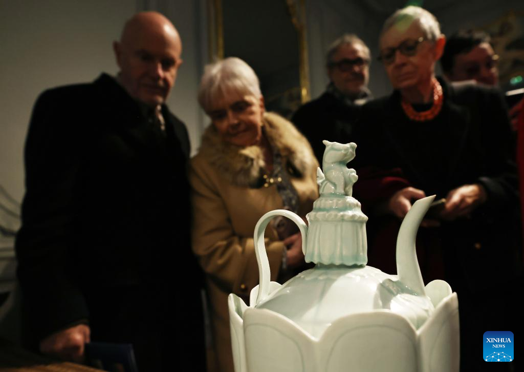 People attend the opening ceremony of an exhibition of porcelain artworks from Jingdezhen of China, in Paris, France, Jan. 30, 2024. The exhibition kicked off here on Tuesday with 48 porcelain artworks on display. (Xinhua/Gao Jing)