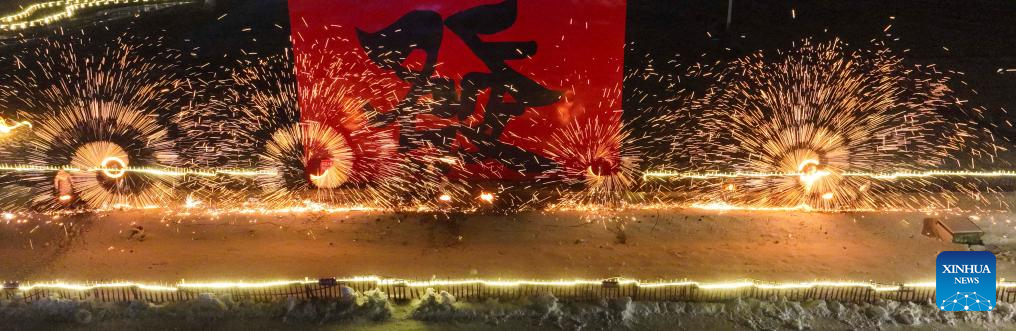 An aerial drone photo taken on Jan. 31, 2024 shows folk artists performing a molten iron fireworks show at an ice and snow festival in Zunhua, north China's Hebei Province. People across China are preparing for the upcoming Spring Festival, the biggest occasion for family reunions, and heralds the beginning of spring. (Photo by Liu Mancang/Xinhua)