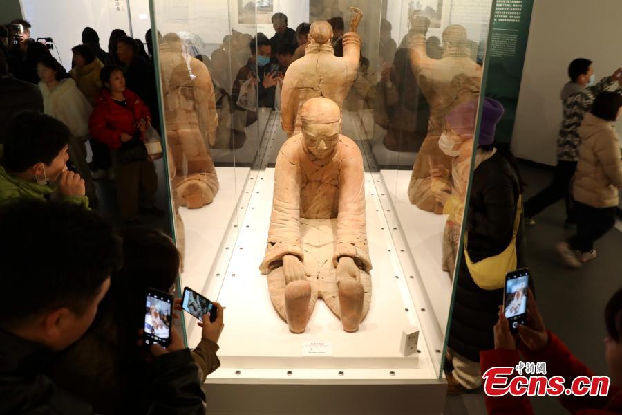 Terracotta figures unearthed at pit K0007 of Qinshihuang Mausoleum are on display at Emperor Qinshihuang's Mausoleum Site Museum in Xi'an, northwest China's Shaanxi Province, Jan. 31, 2024. (Photo: China News Service/Zhang Yuan)