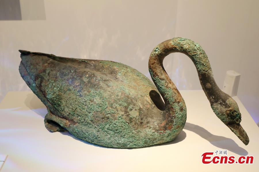 A bronze aquatic bird unearthed at pit K0007 of Qinshihuang Mausoleum is on display at Emperor Qinshihuang's Mausoleum Site Museum in Xi'an, northwest China's Shaanxi Province, Jan. 31, 2024. (Photo: China News Service/Zhang Yuan)