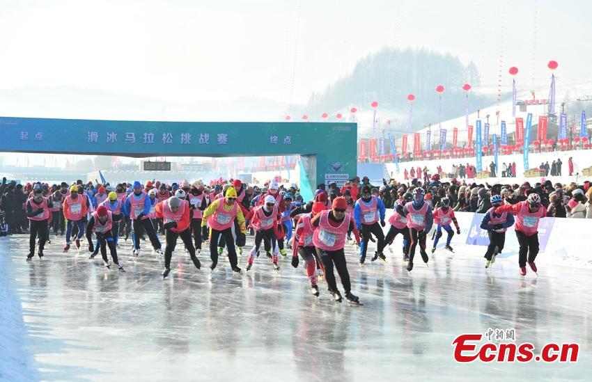 About 7,000 skaters gathered at the frozen Songhuajiang River, clinching the record and 808 participants completed the ice skating marathon in Jingyu county of Baishan city in Northeast China's Jilin province on Tuesday.
