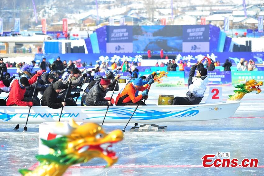 Racers compete in the ice dragon boat race during the first China Jilin Songhua River Ice Skating Marathon in Jingyu County of Baishan City in northeast China's Jilin Province, Jan. 30, 2024, marking a new Guinness World Record for the largest ice skating race series. (Photo: China News Service/Gao Long'an)