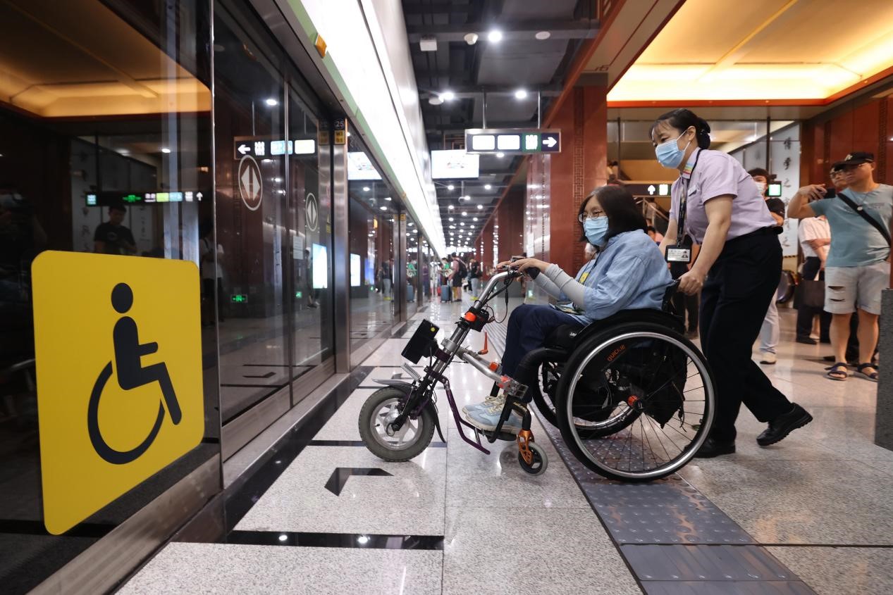 A staff member of Beijing's metro helps a passenger in a wheelchair get on the train. (People's Daily Online/Chen Xiaogen)