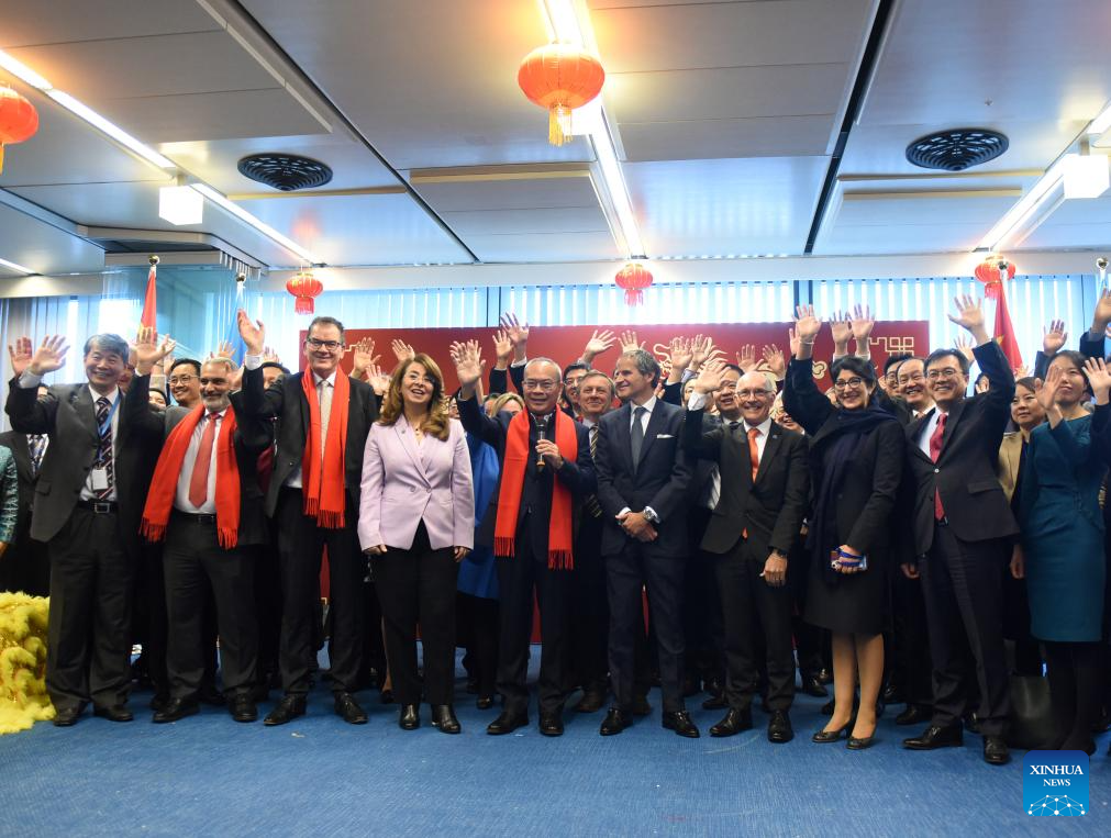 Guests attend a reception to celebrate the Spring Festival at Vienna International Center in Vienna, Austria, Jan. 31, 2024. A reception in celebration of the Spring Festival, co-hosted by China's Permanent Mission to the UN in Vienna and UN Vienna Chinese Culture Club, was held here on Wednesday. It was the first such event staged at the UN Office at Vienna by the permanent mission. (Xinhua/He Canling)
