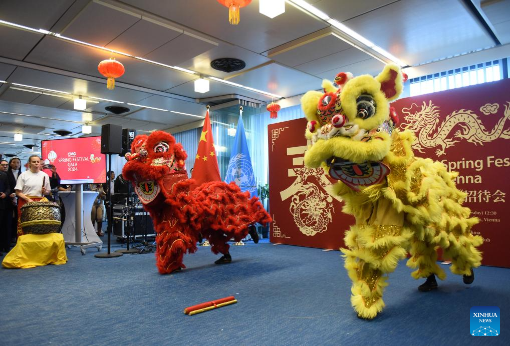 Dancers perform lion dance during a reception to celebrate the Spring Festival at Vienna International Center in Vienna, Austria, Jan. 31, 2024. A reception in celebration of the Spring Festival, co-hosted by China's Permanent Mission to the UN in Vienna and UN Vienna Chinese Culture Club, was held here on Wednesday. It was the first such event staged at the UN Office at Vienna by the permanent mission. (Xinhua/He Canling)
