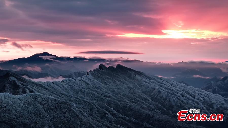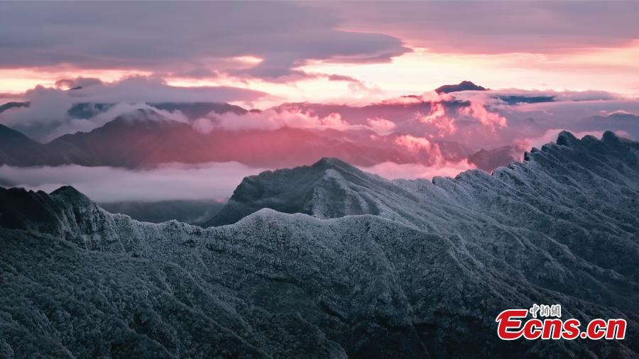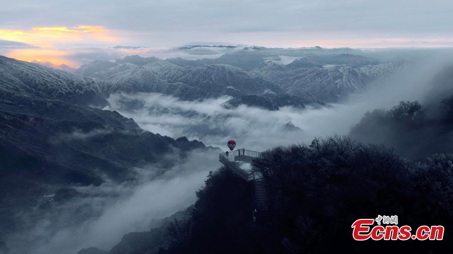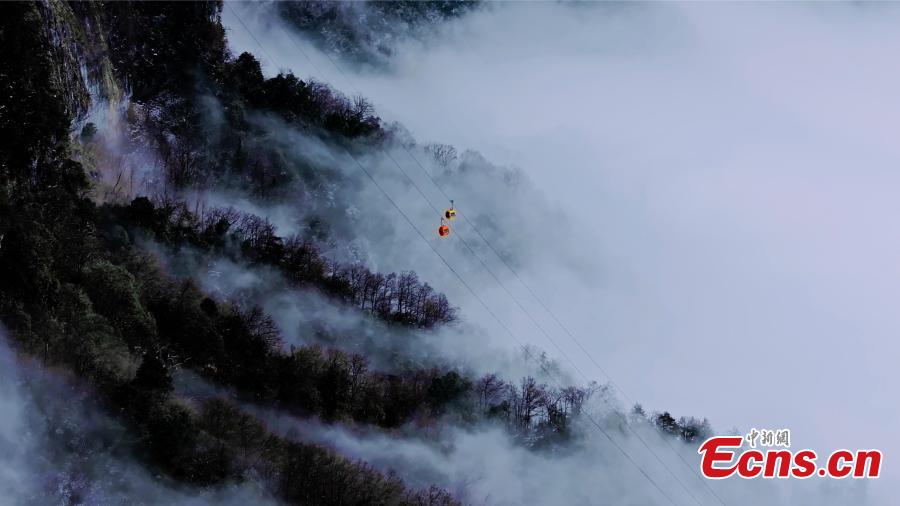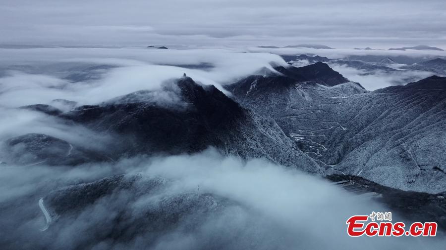 Picturesque scenery of clouds-shrouded Longtou Mountain with snow in Hanzhong, northwest China's Shaanxi Province. (Photo: China News Service/Hu Liang)