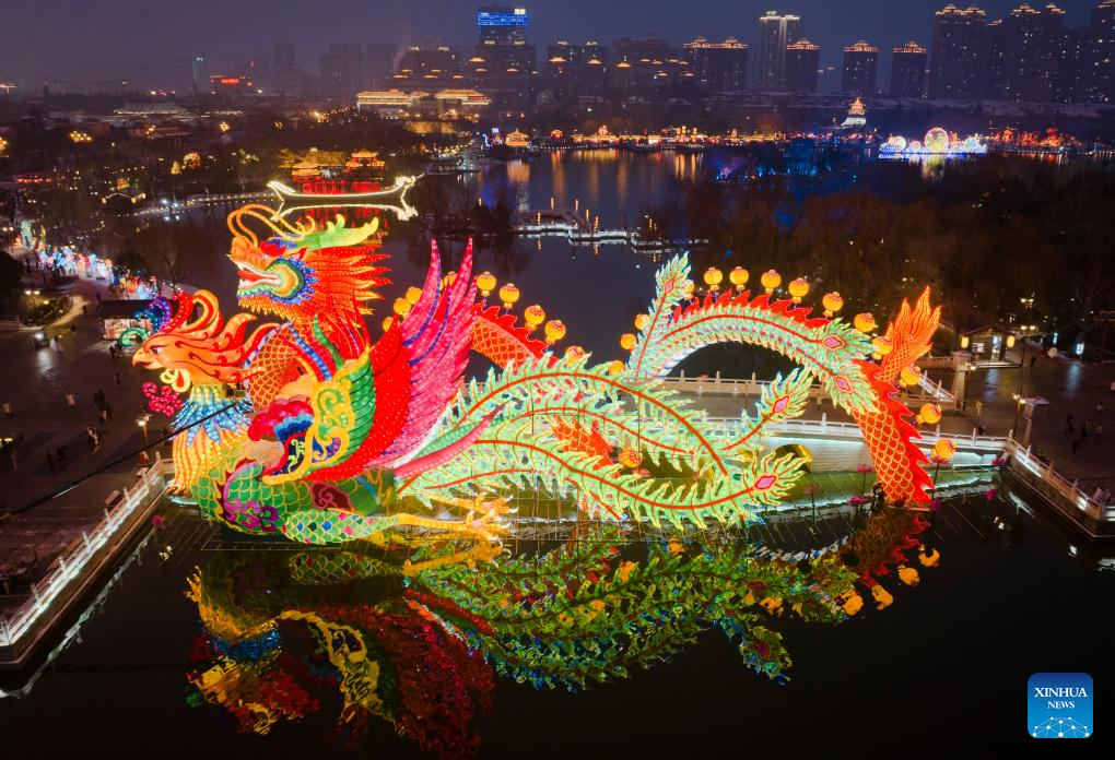 An aerial drone photo taken on Feb. 2, 2024 shows light decorations at the Tang Paradise, a complex based on the site of the original relic of an imperial garden dating back to the Tang Dynasty (618-907), in Xi'an, capital of northwest China's Shaanxi Province. The 2024 Chang'an Light Show started in Xi'an on Friday. Thousands of lights and lanterns decorated many places of interests in the city, including the city wall, the Tang Paradise complex and the Daming Palace National Heritage Park. (Xinhua/Shao Rui)