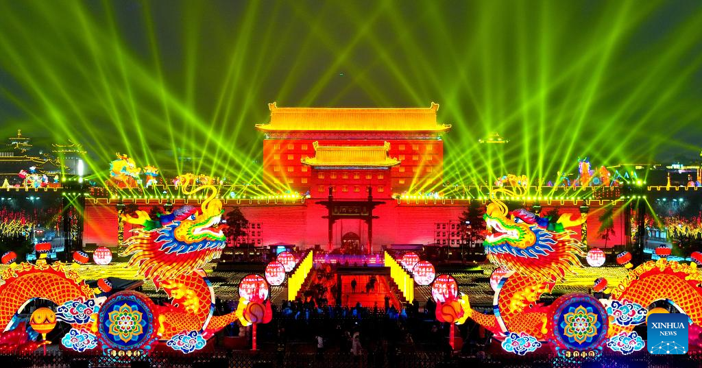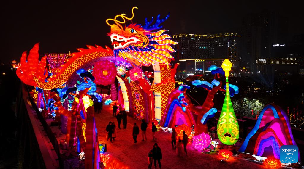A drone photo taken on Feb. 2, 2024 shows light decorations near the city wall of Xi'an, capital of northwest China's Shaanxi Province. The 2024 Chang'an Light Show started in Xi'an on Friday. Thousands of lights and lanterns decorated many places of interests in the city, including the city wall, the Tang Paradise complex and the Daming Palace National Heritage Park. (Xinhua/Liu Xiao)