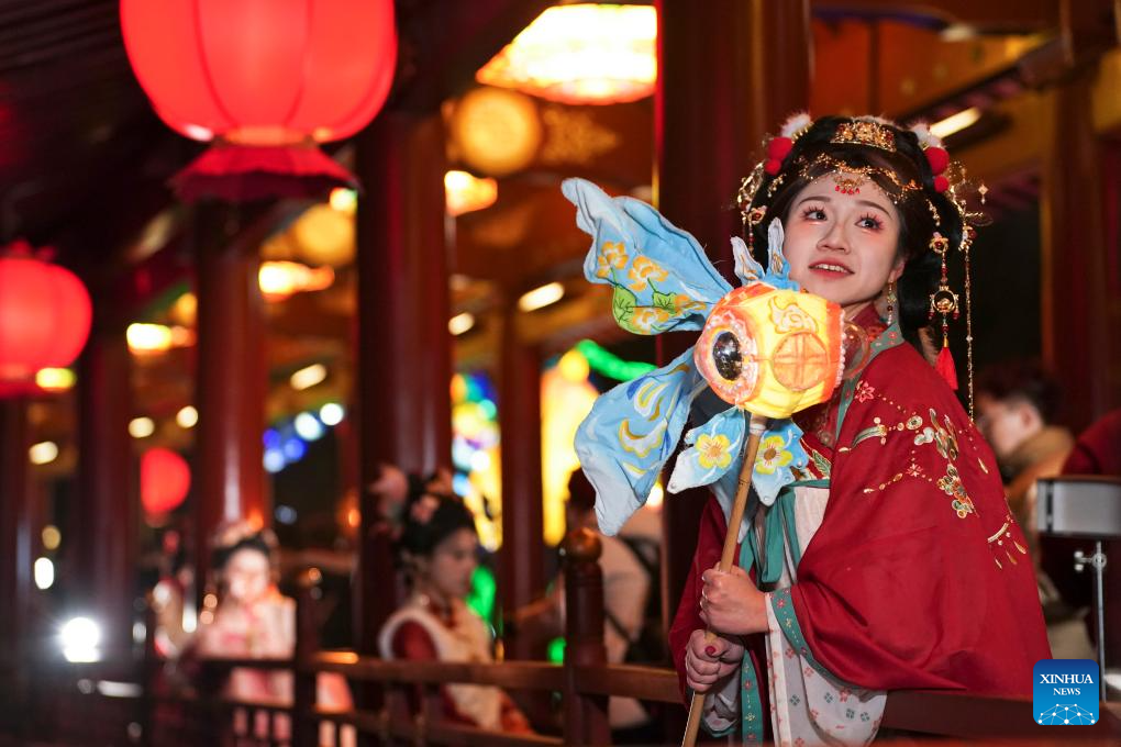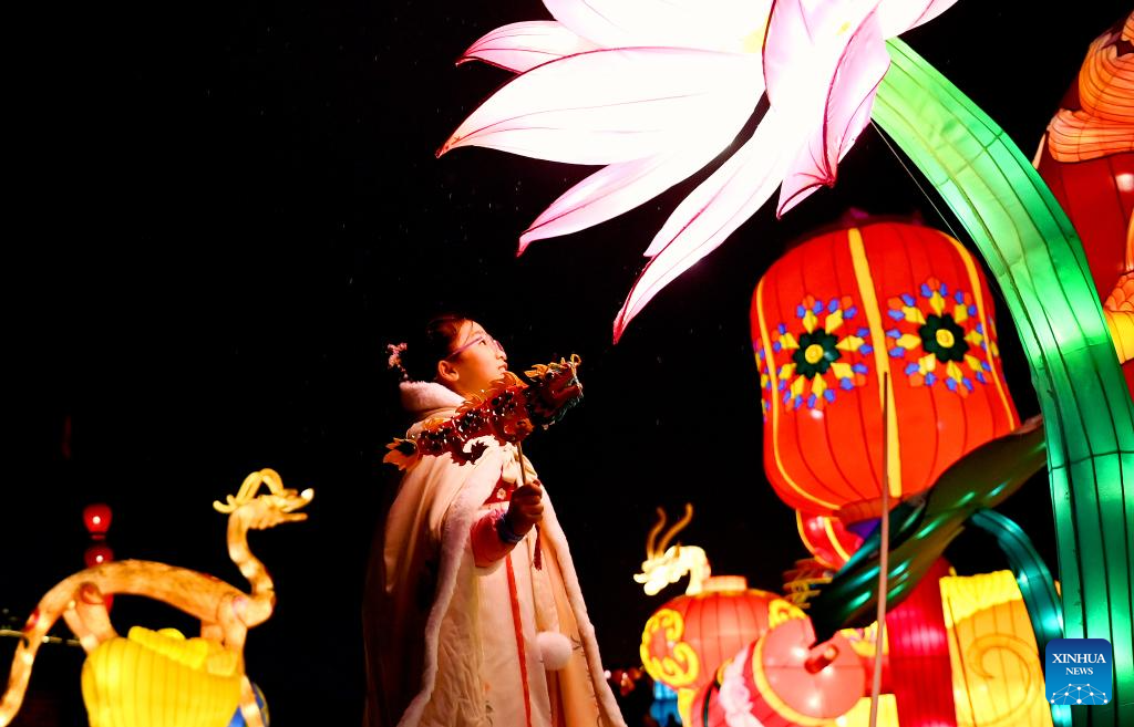 A tourist poses for photos at the Tang Paradise, a complex based on the site of the original relic of an imperial garden dating back to the Tang Dynasty (618-907), in Xi'an, capital of northwest China's Shaanxi Province, Feb. 2, 2024. The 2024 Chang'an Light Show started in Xi'an on Friday. Thousands of lights and lanterns decorated many places of interests in the city, including the city wall, the Tang Paradise complex and the Daming Palace National Heritage Park. (Xinhua/Li Yibo)