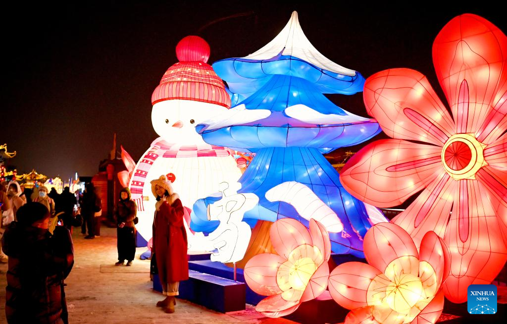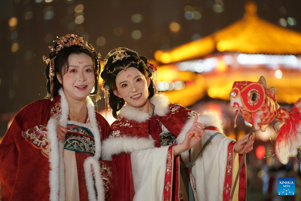 Tourists pose for photos at the Tang Paradise, a complex based on the site of the original relic of an imperial garden dating back to the Tang Dynasty (618-907), in Xi'an, capital of northwest China's Shaanxi Province, Feb. 2, 2024. The 2024 Chang'an Light Show started in Xi'an on Friday. Thousands of lights and lanterns decorated many places of interests in the city, including the city wall, the Tang Paradise complex and the Daming Palace National Heritage Park. (Xinhua/Shao Rui)