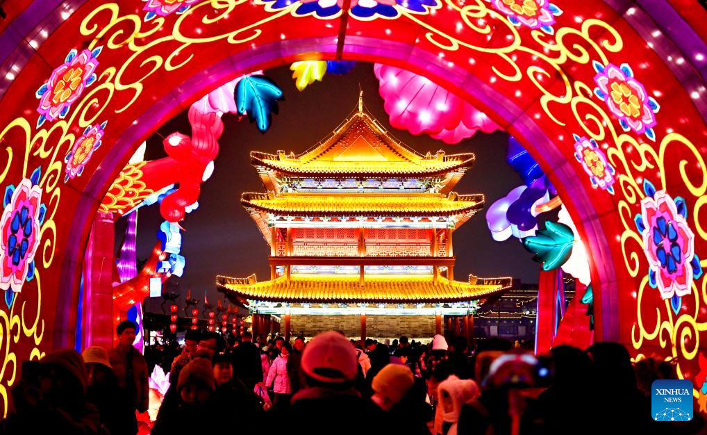 Tourists walk amid light decorations on the city wall of Xi'an, capital of northwest China's Shaanxi Province, Feb. 2, 2024. The 2024 Chang'an Light Show started in Xi'an on Friday. Thousands of lights and lanterns decorated many places of interests in the city, including the city wall, the Tang Paradise complex and the Daming Palace National Heritage Park. (Xinhua/Zou Jingyi)