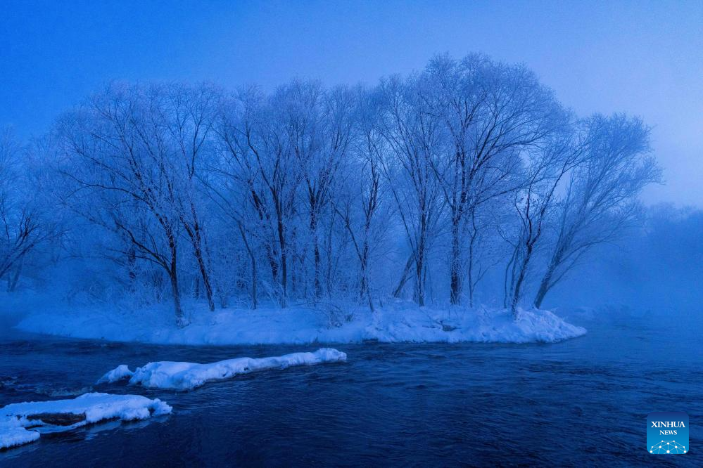 During harsh winter conditions, the supercooled water droplets from the Kurbin River rise and form rime on branches of trees along the bank when the river flows through Pingtai Village of Xunke County. This picturesque rime scenery attracts tourists from around the country.