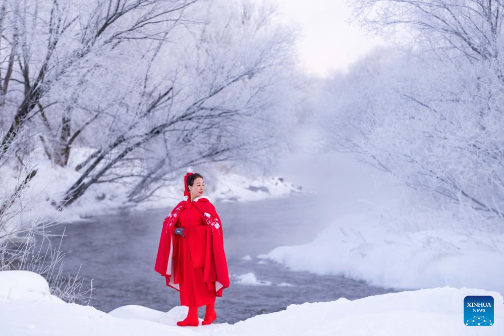 A tourist enjoys the rime scenery along the Kurbin River near Pingtai Village in Xunke County of Heihe, northeast China's Heilongjiang Province, Feb. 2, 2024. (Xinhua/Xie Jianfei)