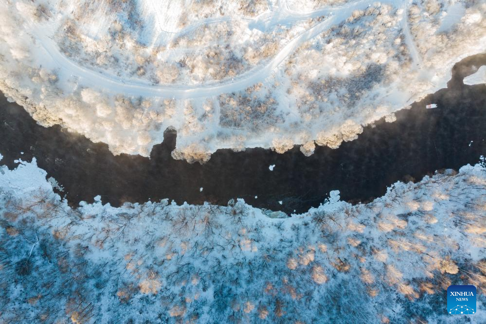 An aerial drone photo taken on Feb. 2, 2024 shows the rime scenery along the Kurbin River near Pingtai Village in Xunke County of Heihe, northeast China's Heilongjiang Province. (Xinhua/Xie Jianfei)